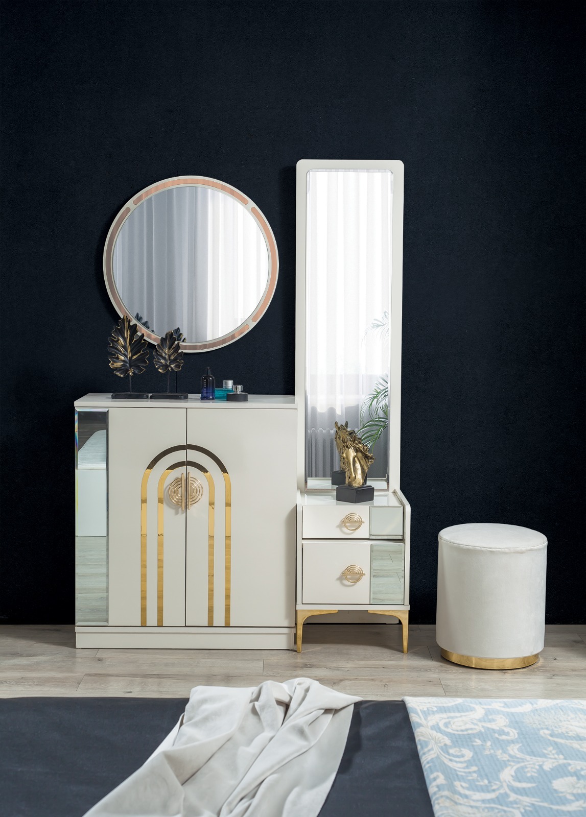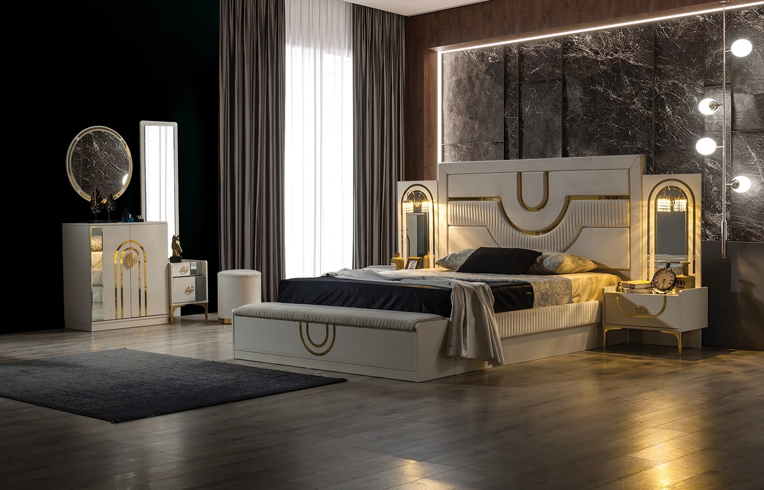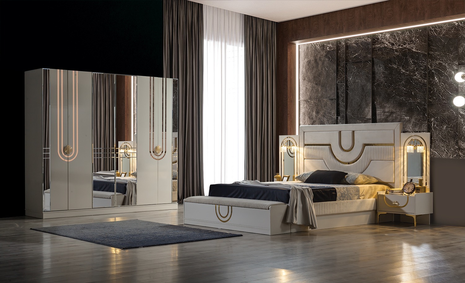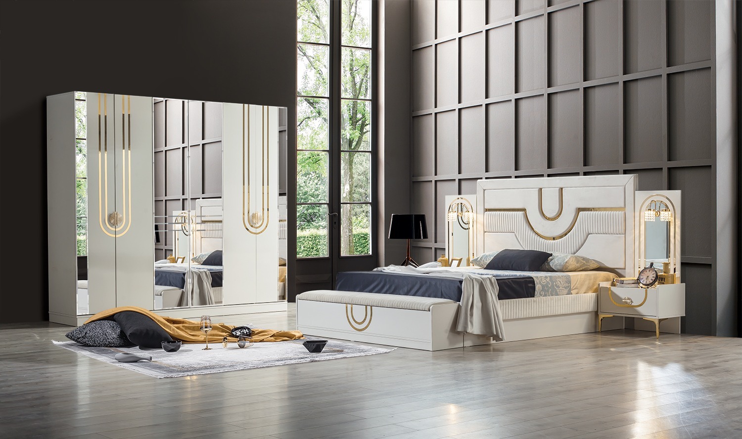 TAKIM İÇERİĞİ Bir gardırop, bir şifonyer, bir bazalı karyola, bir başlık, iki komodin, bir bench, bir çekmeceli boy aynası ve bir puftan oluşmaktadır