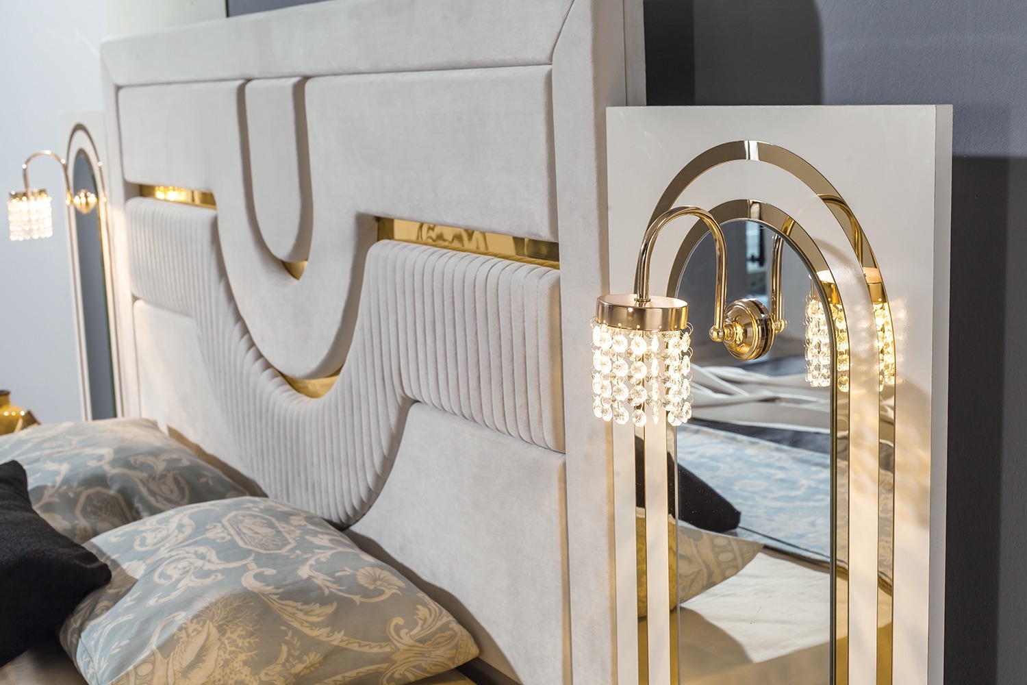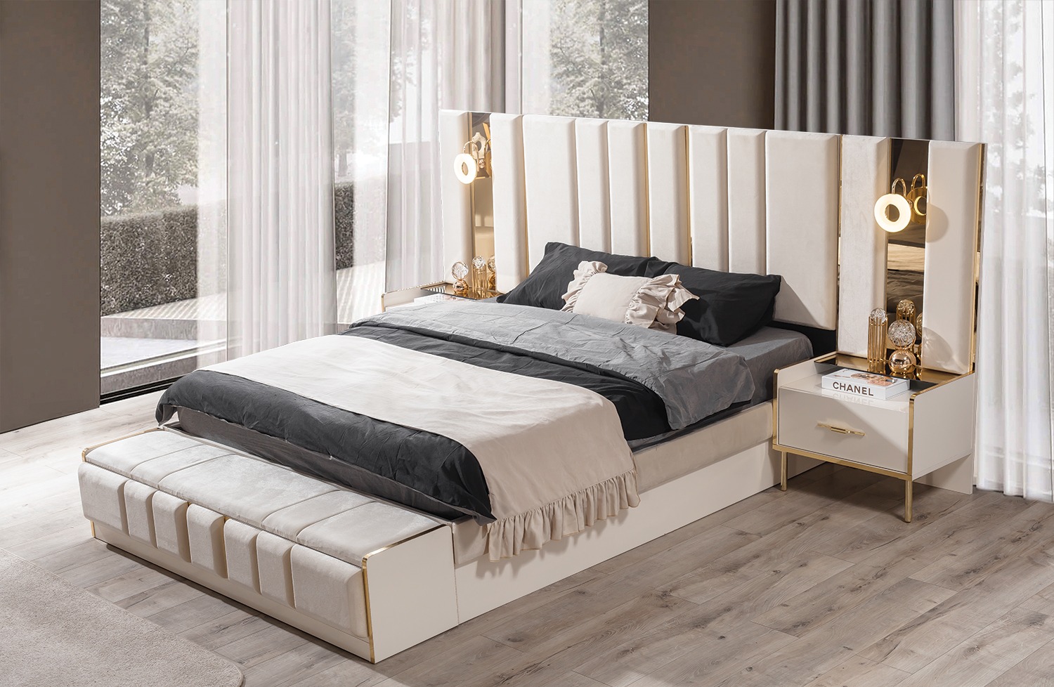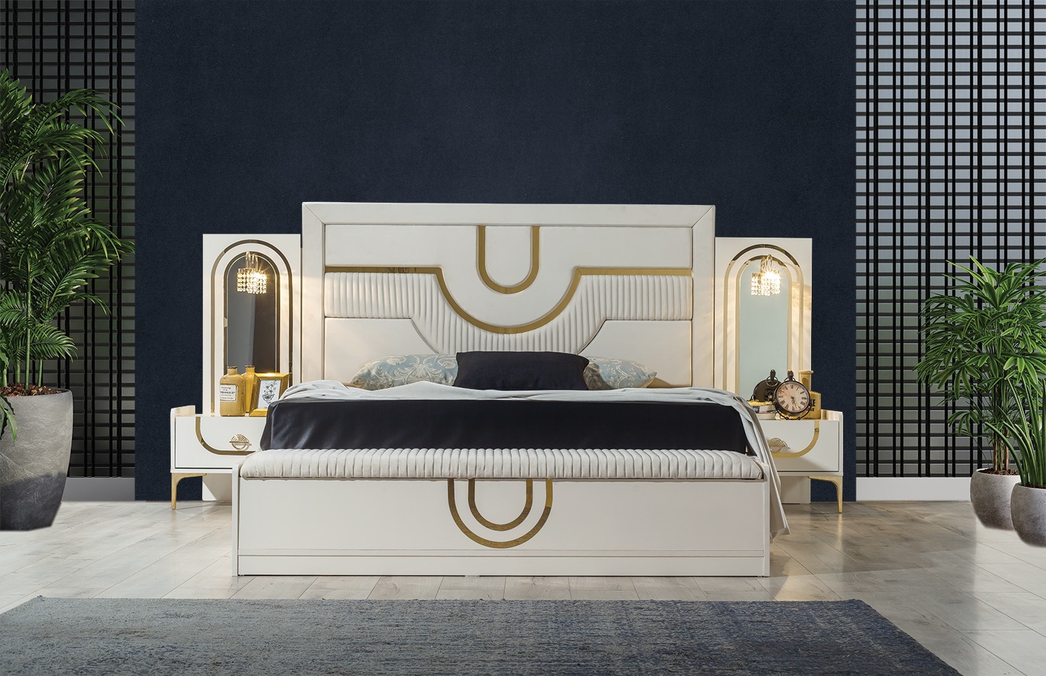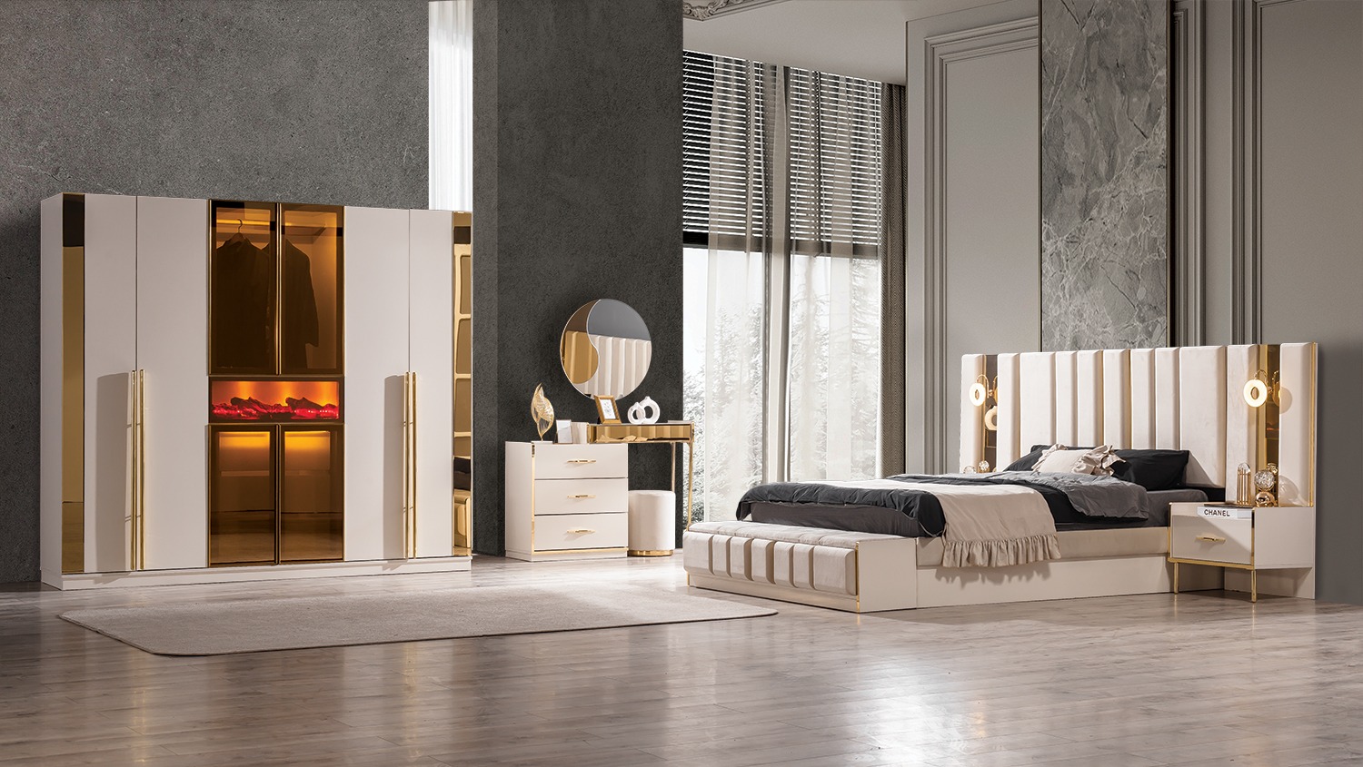 TAKIM İÇERİĞİ Bir gardırop, bir şifonyer, bir bazalı karyola, bir başlık, iki komodin, bir bench, bir çekmeceli boy aynası ve bir puftan oluşmaktadır