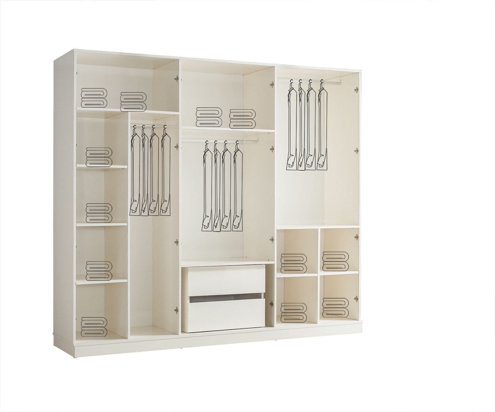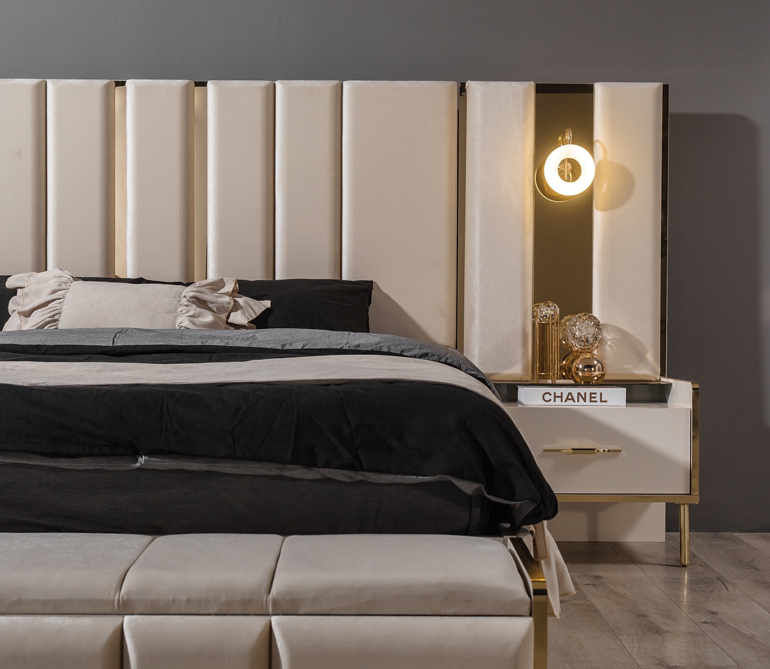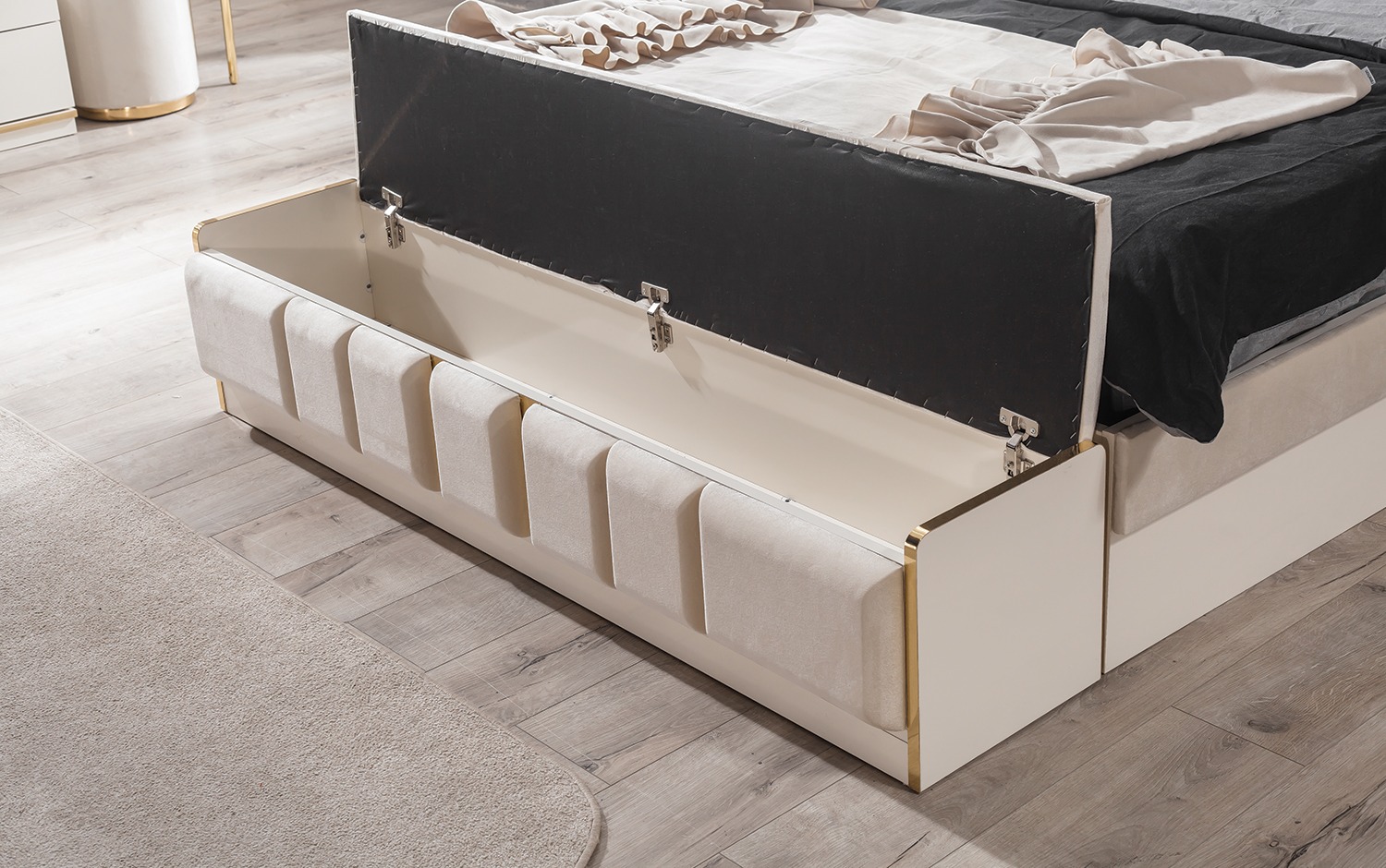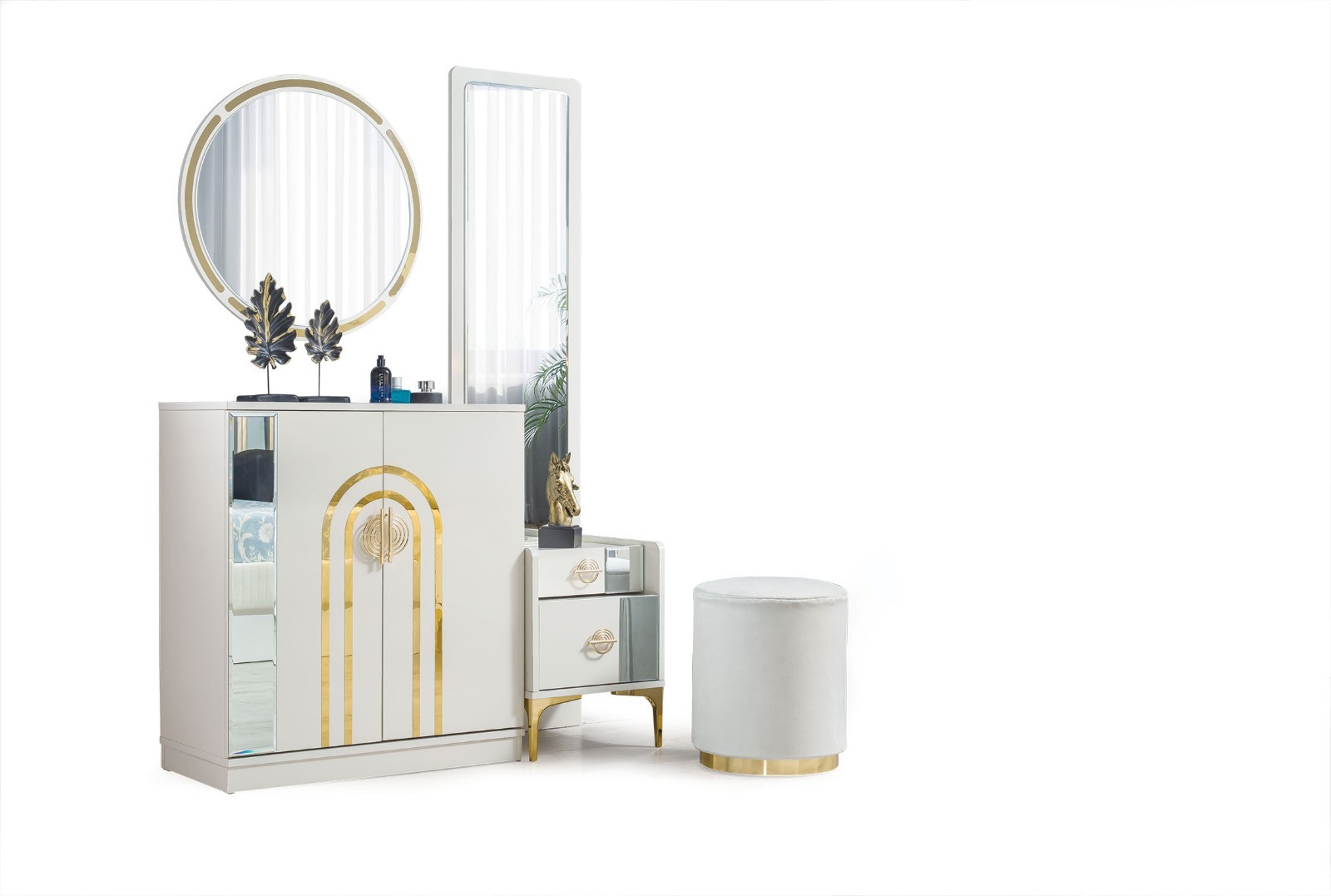 TAKIM İÇERİĞİ Bir gardırop, bir şifonyer, bir bazalı karyola, bir başlık, iki komodin, bir bench, bir çekmeceli boy aynası ve bir puftan oluşmaktadır